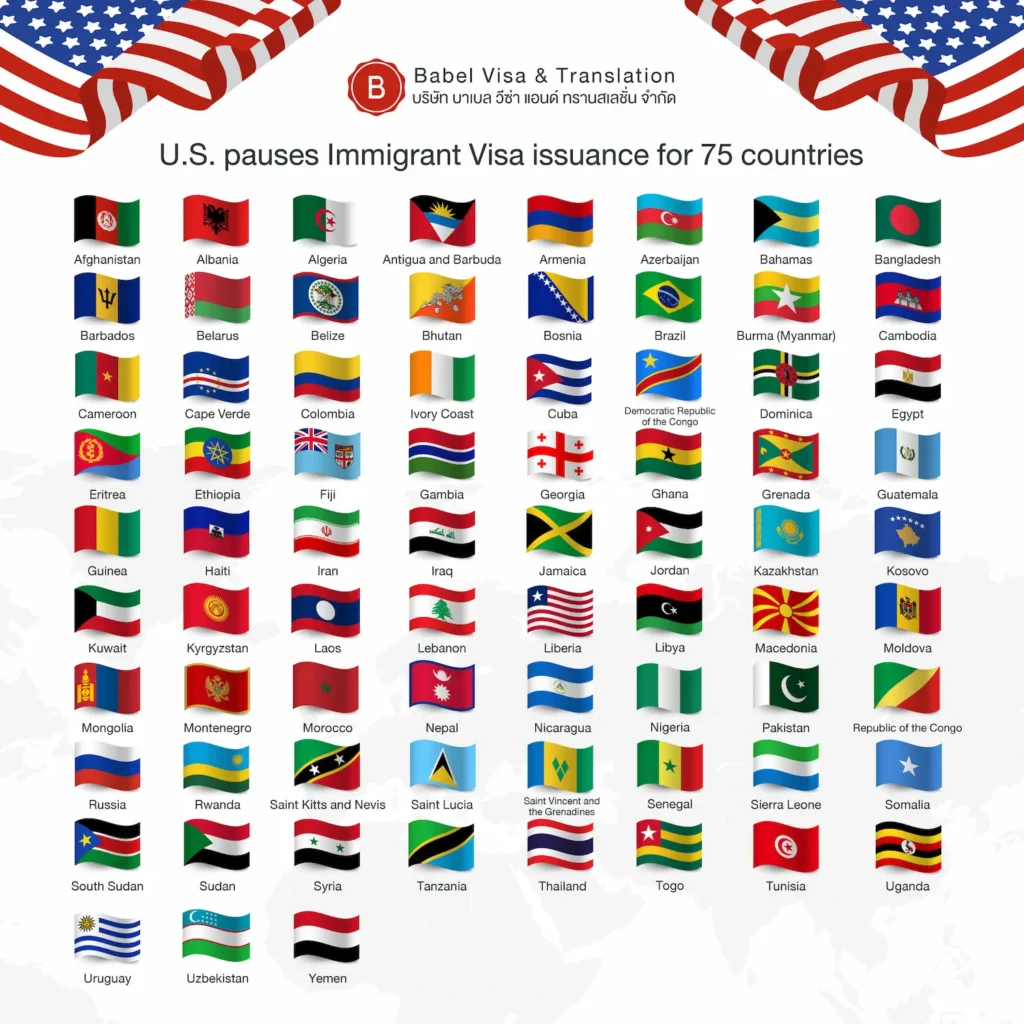 ตามประกาศจากกระทรวงการต่างประเทศสหรัฐอเมริกา ที่แจ้งมาอย่างชัดแจงว่า “กระทรวงการต่างประเทศสหรัฐฯ จะระงับการออกวีซ่าถาวร (Immigrant Visa) สำหรับ 75 ประเทศซึ่งมีผู้อพยพเข้ามาใช้สวัสดิการของชาวอเมริกันในระดับที่เกินกว่าจะยอมรับได้ โดยการระงับนี้จะมีผลต่อไปจนกว่าสหรัฐฯ จะสามารถมั่นใจได้ว่า ผู้อพยพใหม่จะไม่เข้ามาเบียดบังเอาความมั่งคั่งไปจากชาวอเมริกัน” อ้างอิงจาก https://travel.state.gov/content/travel/en/us-visas/visa-information-resources/all-visa-categories.html